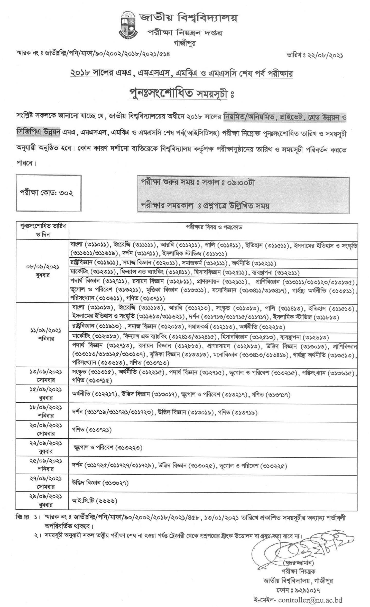 ২০১৮ সালের এম এ, এম এস এস. এম বি এ ও এম এস সি শেষ পর্বের (আইসিটিসহ) স্থগিত পরীক্ষার পুনঃনির্ধারিত সময়সূচি: