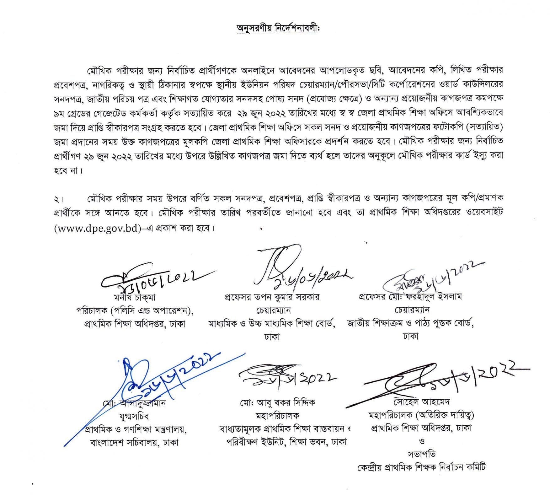 তৃতীয় ধাপে উত্তীর্ণদের মৌখিক পরীক্ষার সময় সব সনদপত্র, প্রাপ্তি স্বীকারপত্র ও অন্যান্য কাগজপত্রের মূল কপি প্রার্থীকে সঙ্গে আনতে হবে। মৌখিক পরীক্ষার তারিখ পরবর্তীতে জানানো হবে এবং তা প্রাথমিক শিক্ষা অধিদপ্তরের ওয়েবসাইটে দেওয়া হবে।