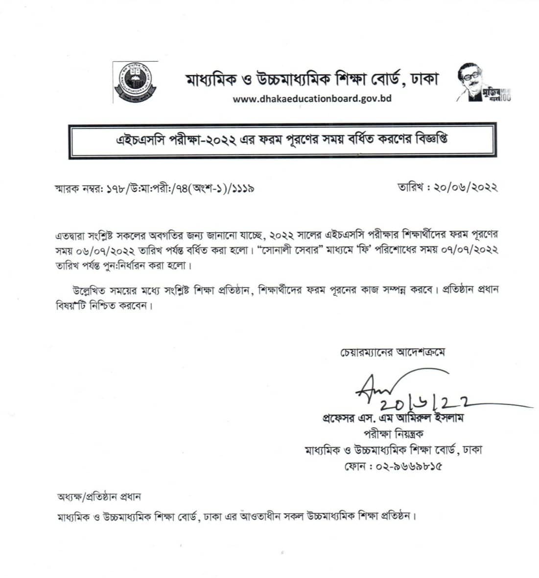 সোমবার ২০ জুন মাধ্যমিক ও উচ্চমাধ্যমিক শিক্ষা বোর্ড, ঢাকা এর পরীক্ষা নিয়ন্ত্রক প্রফেসর এস.এম. আমিরুল ইসলাম স্বাক্ষরিত ‘এইচএসসি পরীক্ষা-২০২২ এর ফরম পূরণের সময় বর্ধিত করণ সংক্রান্ত’ এক বিজ্ঞপ্তিতে বলা হয়েছে উল্লেখিত সময়ের মধ্যে সংশ্লিষ্ট শিক্ষা প্রতিষ্ঠান,শিক্ষার্থীদের ফরম পূরণের কাজ সম্পন্ন করবে।